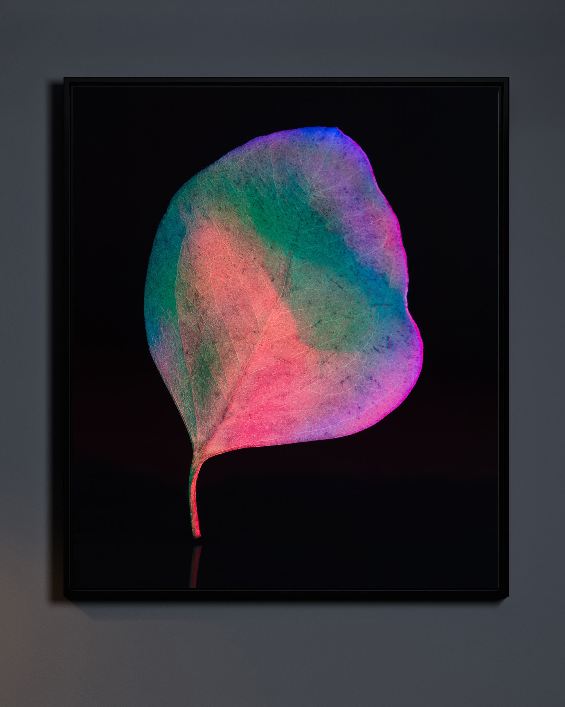 This striking wall artwork features a vibrant, colourful leaf captured against a sleek black background. The vivid hues pop in contrast to the deep darkness, creating a bold and dynamic composition. The simplicity of the background allows the intricate details and natural beauty of the leaf to shine. Perfect for adding a touch of nature’s elegance and color to your walls.