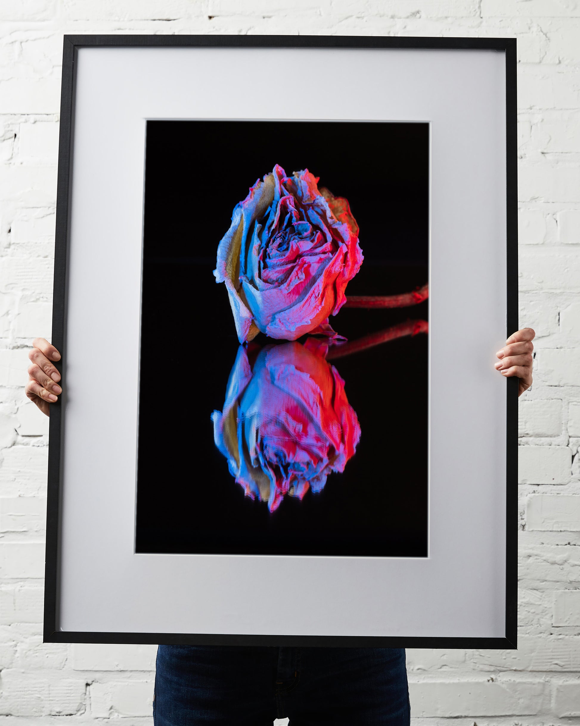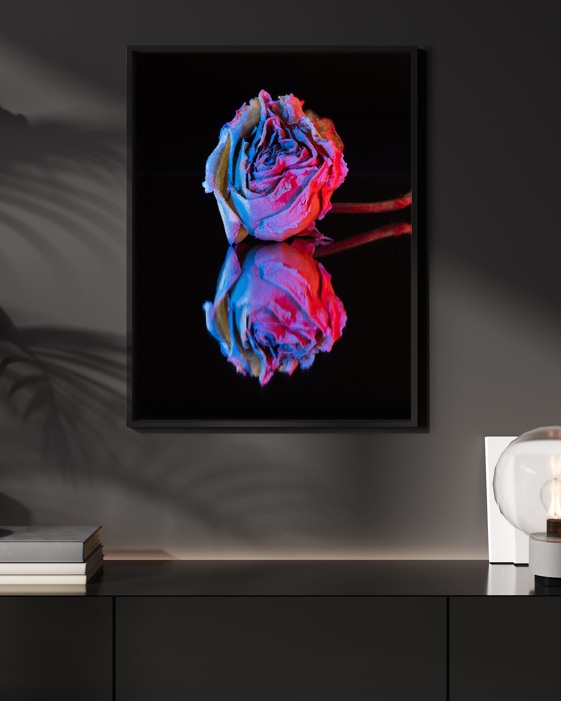This stunning printed artwork features a decaying rose. The interplay of light and reflection adds depth and drama, emphasizing the delicate textures and rich hues of the flower. A captivating blend of fragility and elegance, this piece serves as a reminder that beauty exists in every stage of life. Perfect for adding a touch of artistic sophistication to any space.
