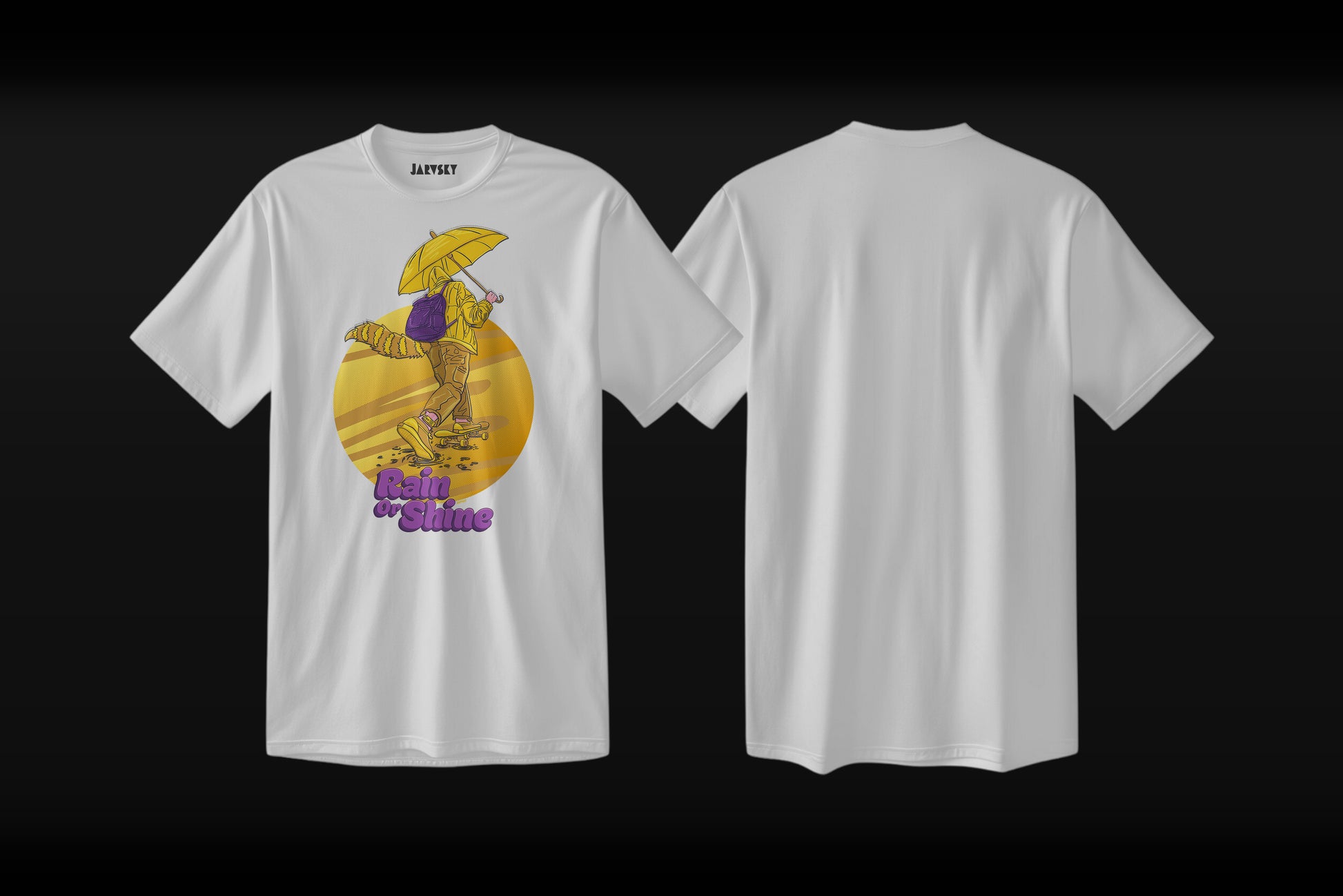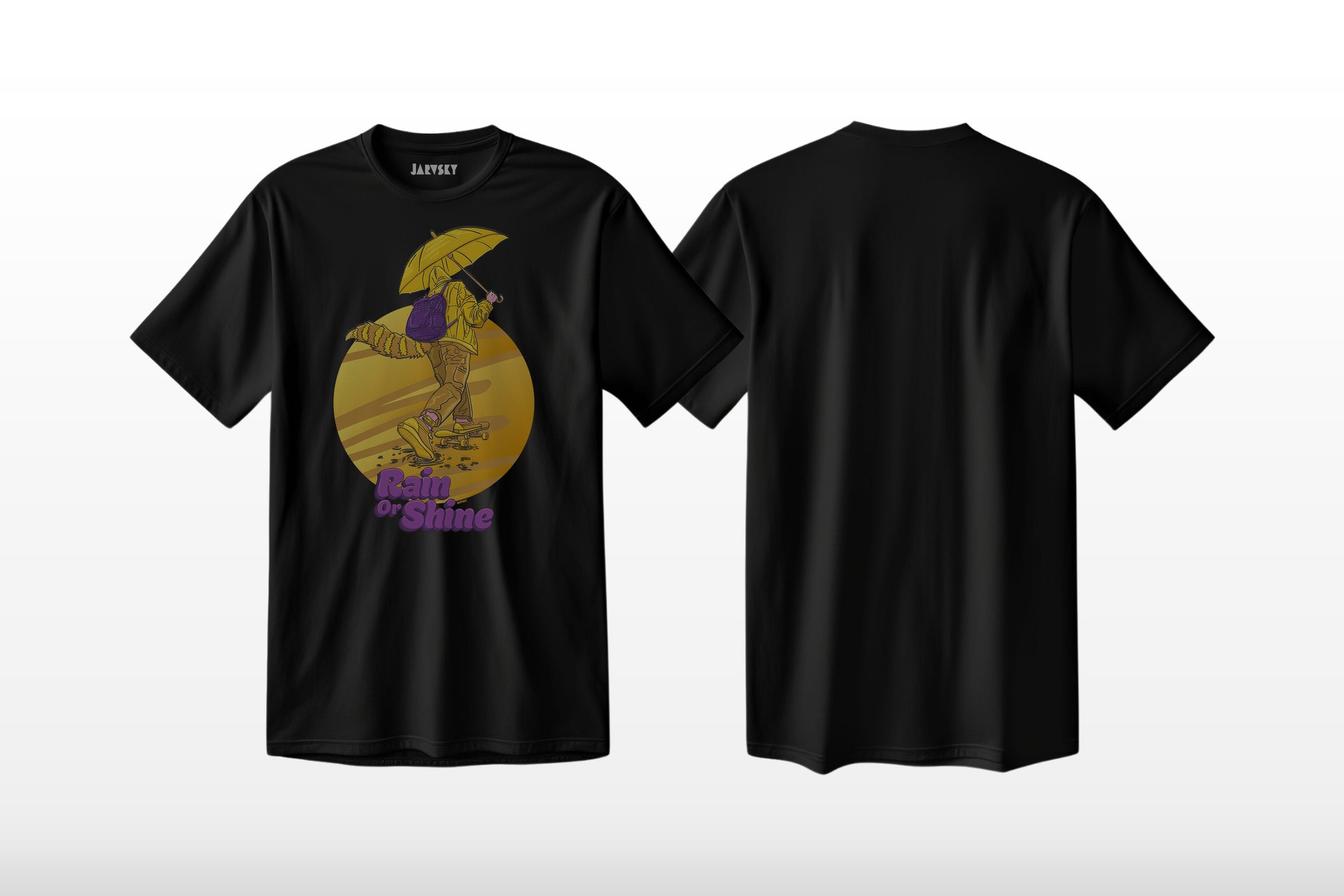 Inspired by the soaked sidewalks and golden glimmers of Vancouver’s sunsets, this limited-edition T-shirt features a playful illustration of a skateboarder cruising through the rain. With bold purples and sun-drenched yellows, it’s a tribute to those who skate through whatever life throws at them — rain or shine.Artwork by Jarvsky