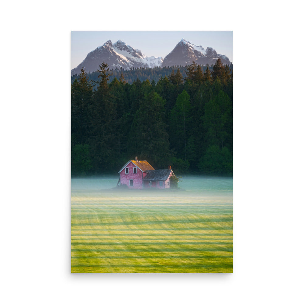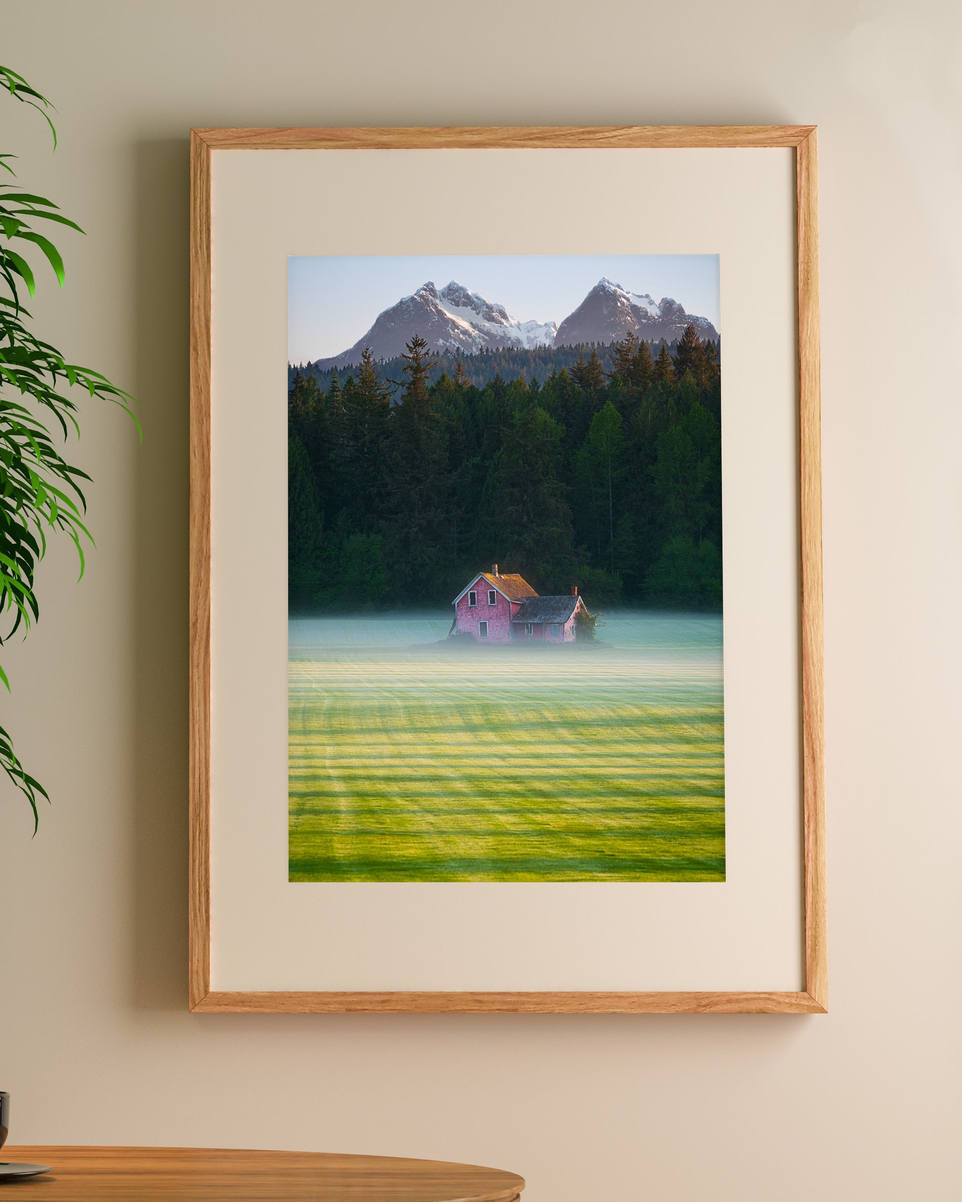 A charming old red farmhouse sits in a lush green field, bathed in the warm, golden light of the morning sun. The peaceful British Columbia countryside is beautifully highlighted, with the vibrant green grass contrasting against the red farmhouse and coastal mountains in the background, creating a striking and inviting scene.