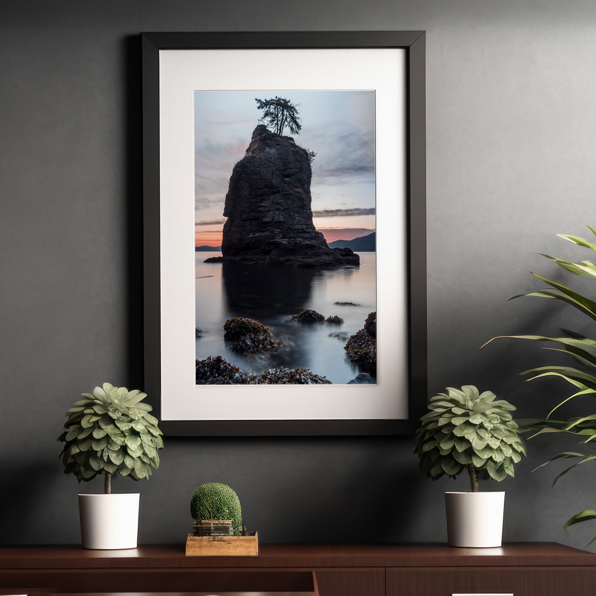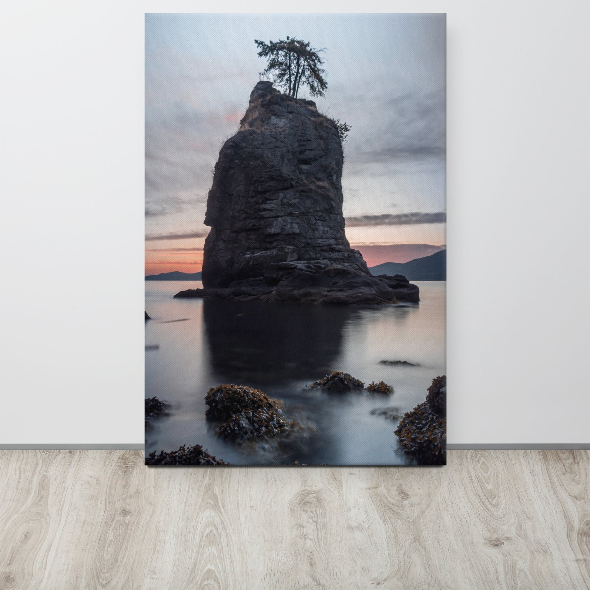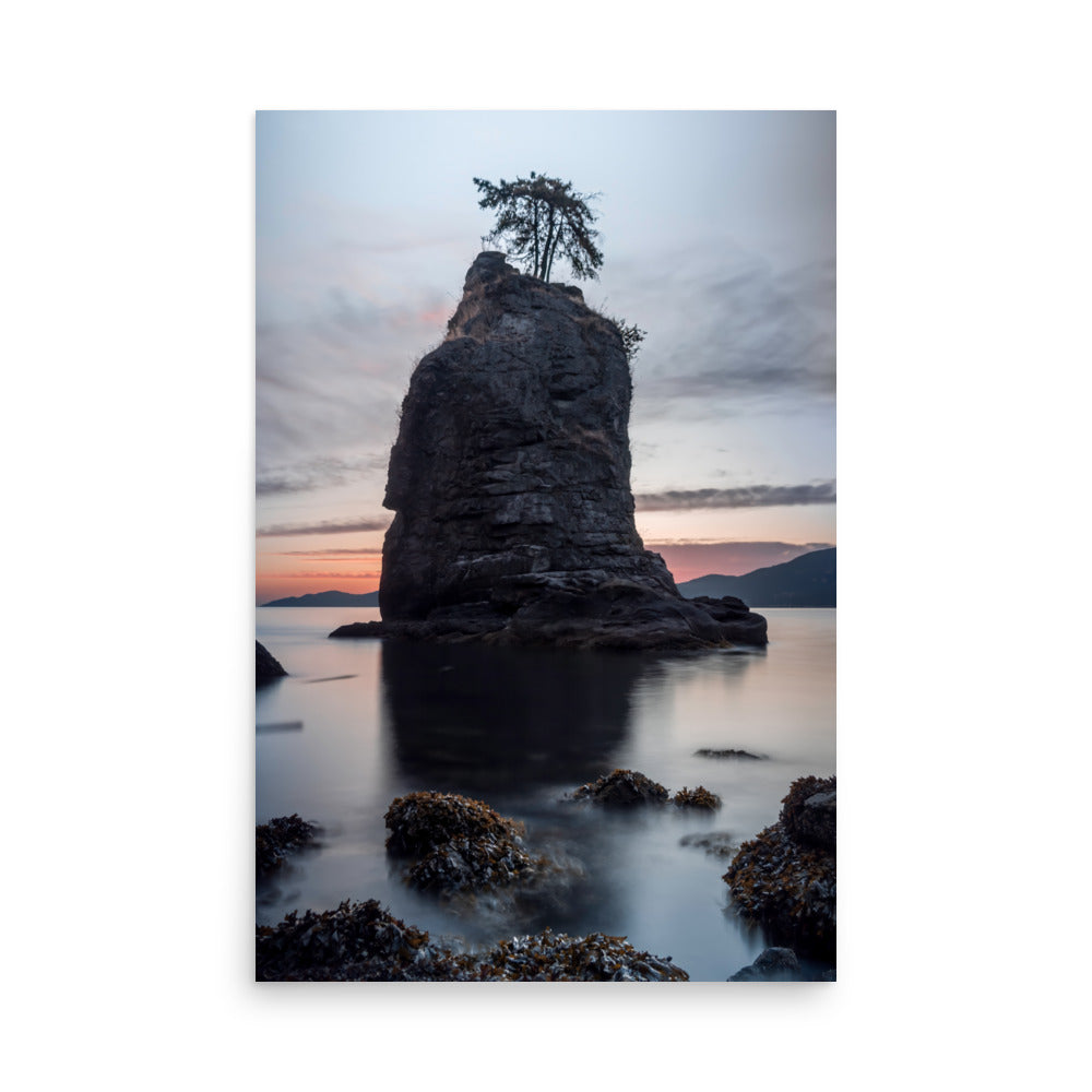 Captured during a serene sunset, this photograph of Vancouver's iconic Siwash Rock reveals the natural beauty of the Pacific Northwest. The rock stands majestically against the backdrop of a vibrant sky painted in hues of orange and blue. The tranquil ocean reflects the fading sunlight, creating a harmonious blend of colors that accentuates the silhouette of the rock. This image encapsulates a moment of peaceful solitude and timeless beauty, offering a glimpse into the enchanting landscapes of Vancouver.