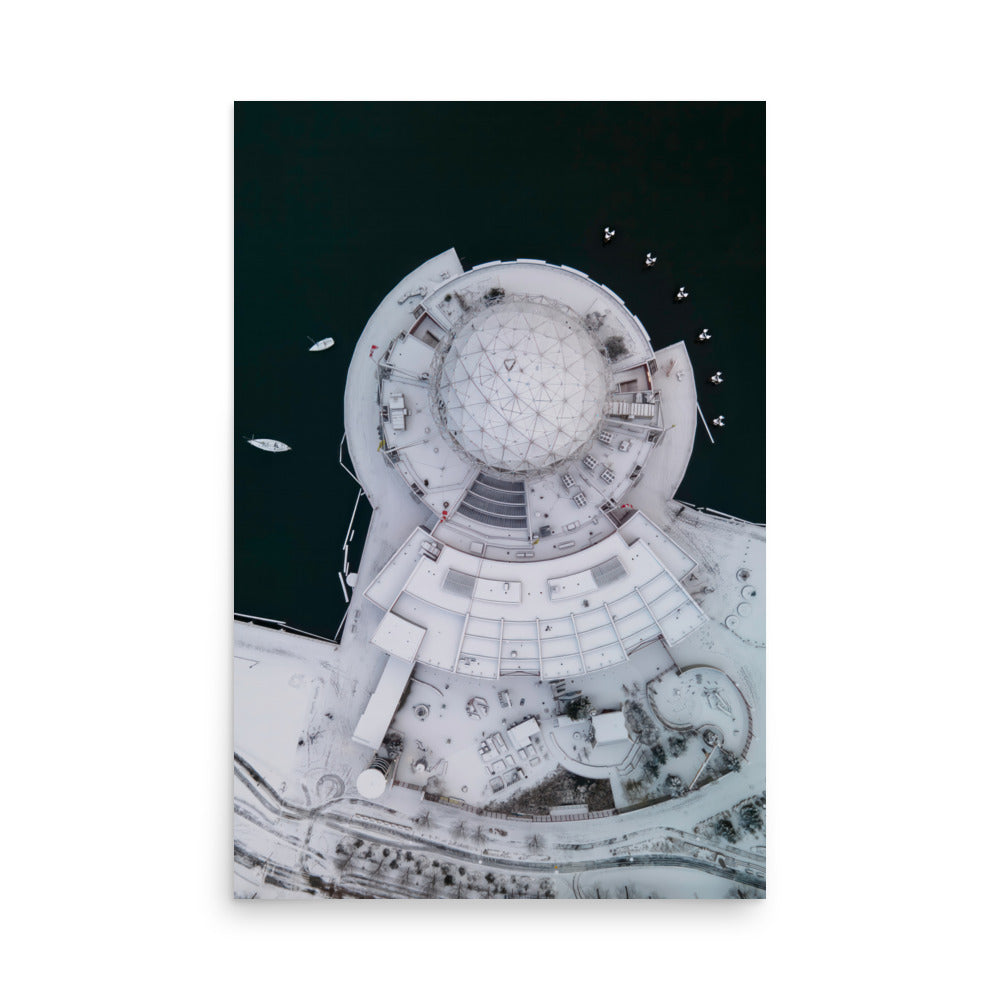 This photo showcases Vancouver's Science World after a snowstorm, its iconic geodesic dome blanketed in pristine white. The fresh snow contrasts beautifully with the metallic structure, creating a striking winter wonderland. Soft morning light casts a gentle glow, enhancing the serene, magical atmosphere of this urban landmark transformed by winter.